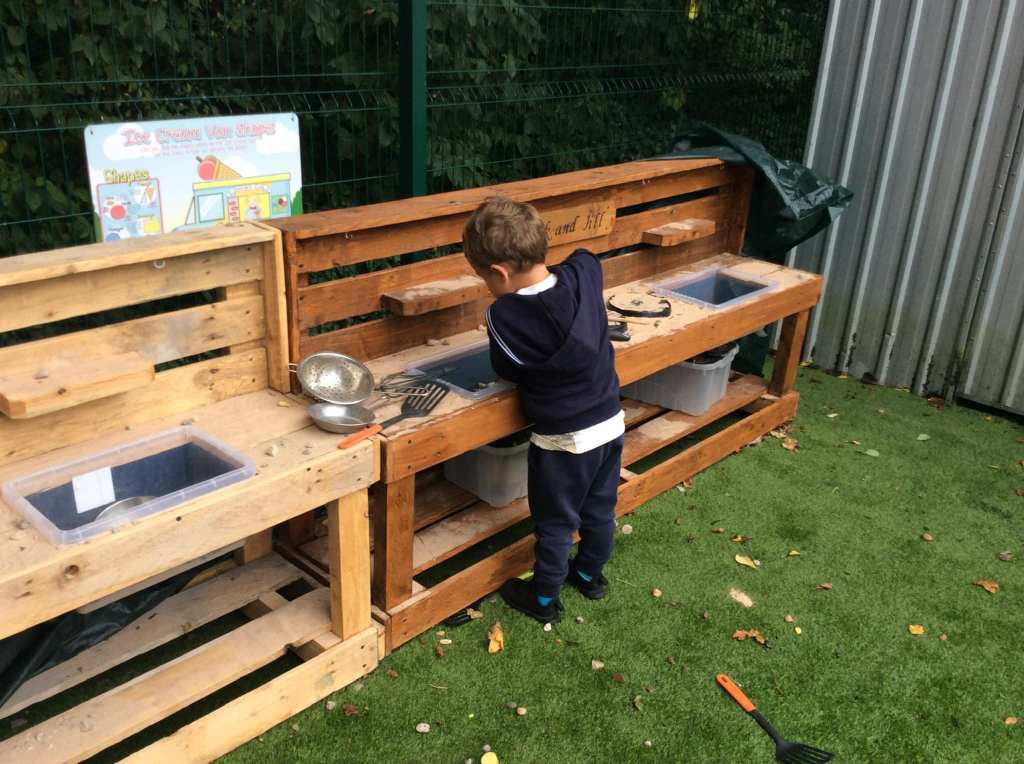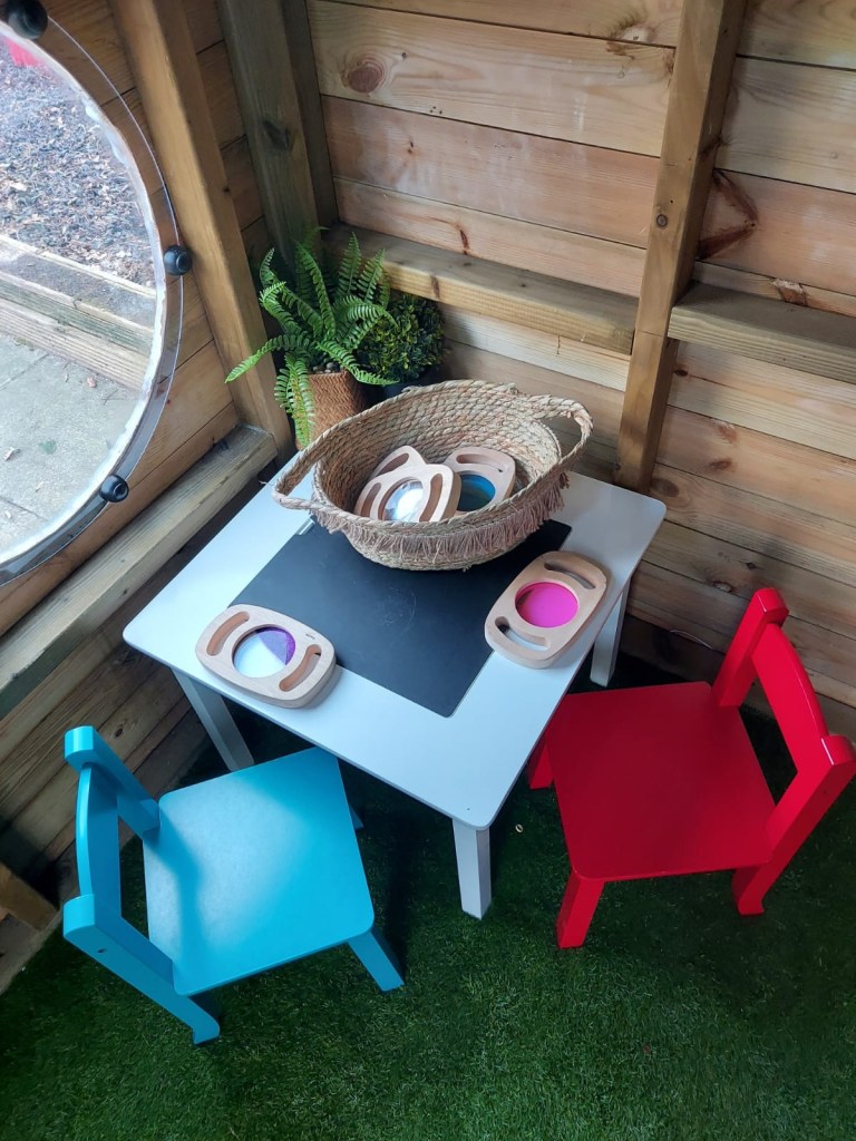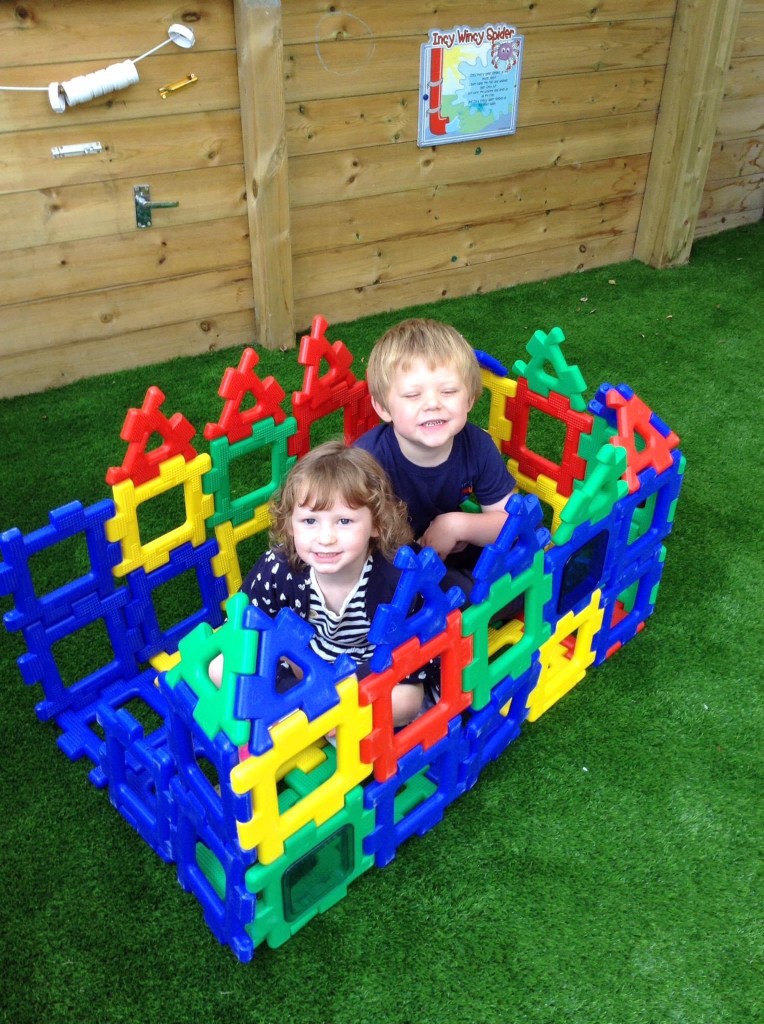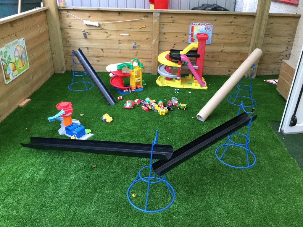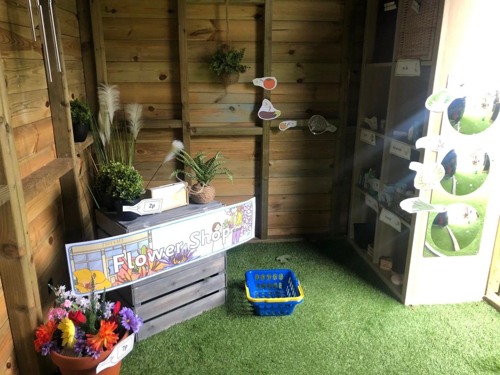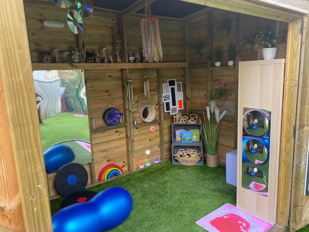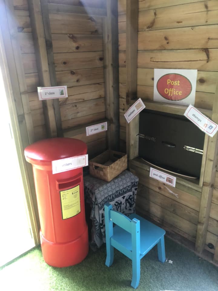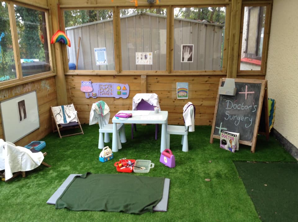 We have our outdoor classroom which is changed regularly we use it for small group activities, it has been a sensory room and various role play areas.