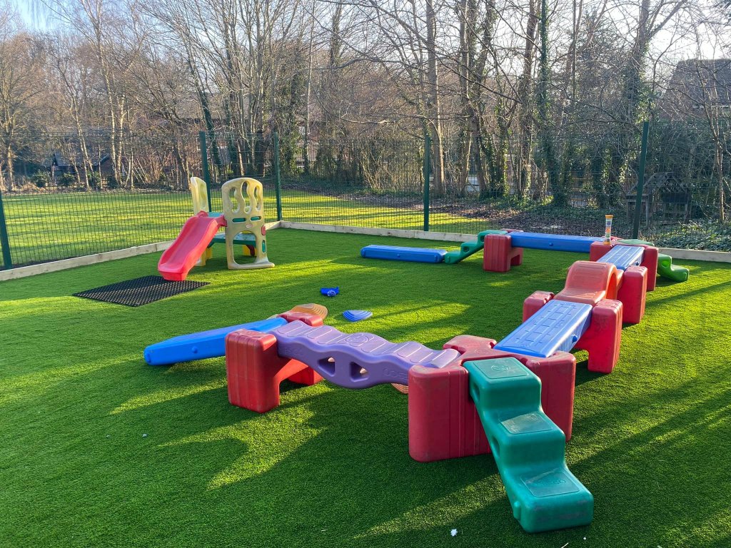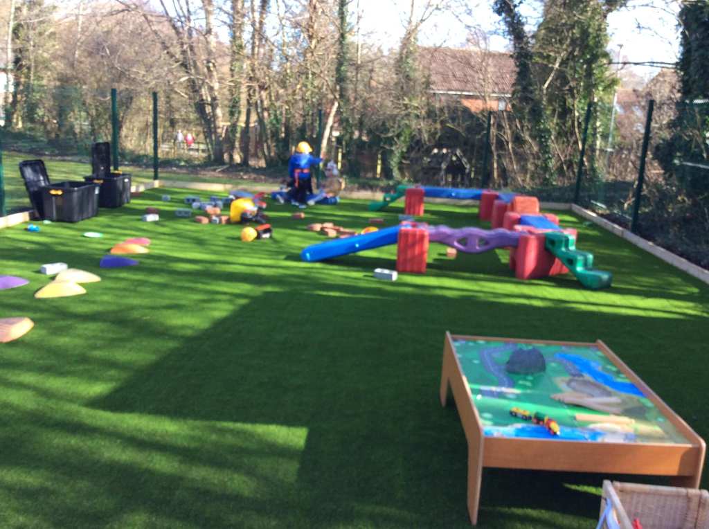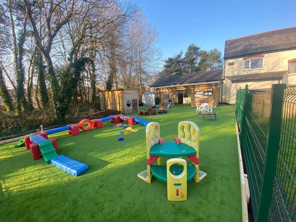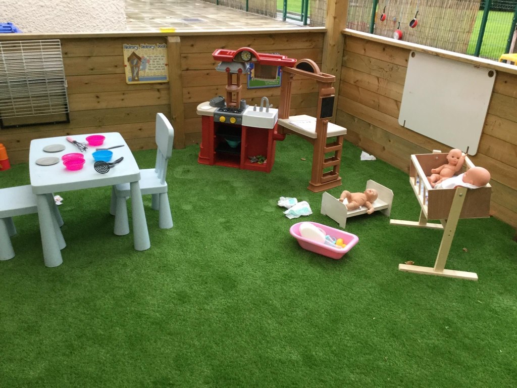 We have our another outdoor classroom area which is finished off with artificial grass, this means the children can come outside in all weathers but be able to keep dry. This area changes often and activities in here can range from a large role play area to small world toys or even arts and crafts.