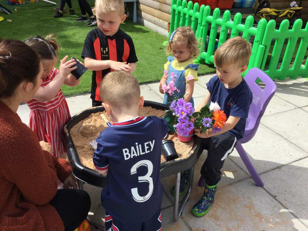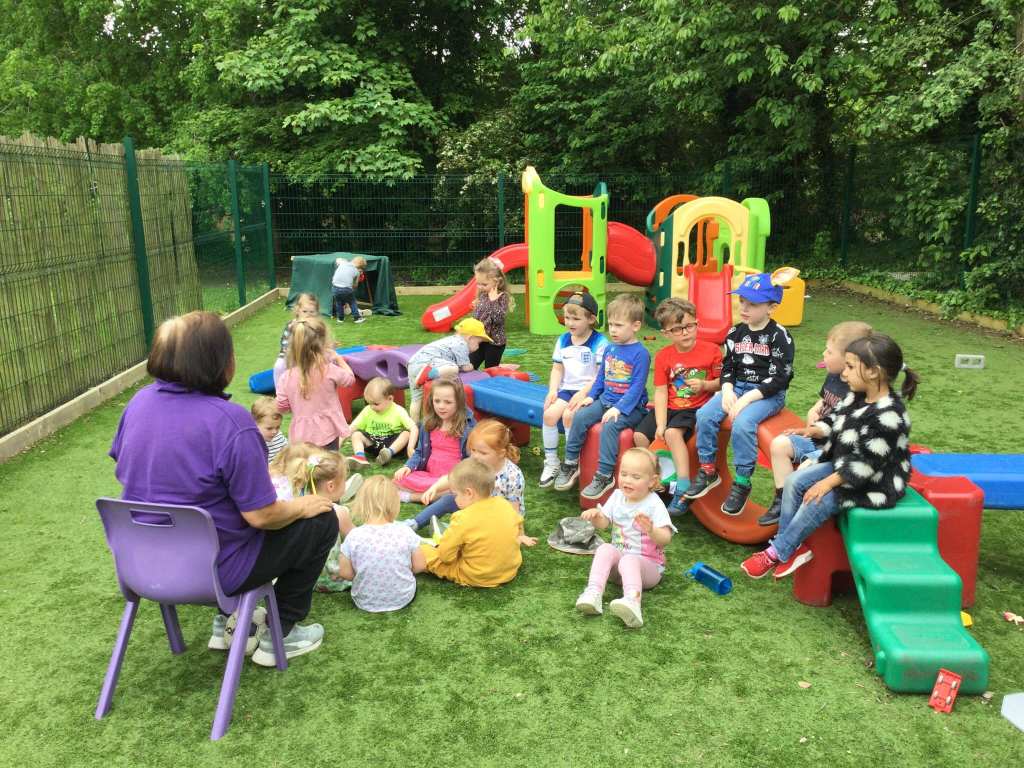 Thanks to lots of successful fundraising we have recently upgraded our outdoor area and had more artifical grass put down, covering the majority of the garden. This area is where we set up tuff trays and floor activities as well as role play/ sand and water or art and crafts. We also have a large flagged area which use for bikes, scooters etc where the children can run around and not bump into any activities.